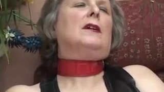 Raven head voracious granny of my comrade drills her dumpy smelly slit with tremendous fuck toy